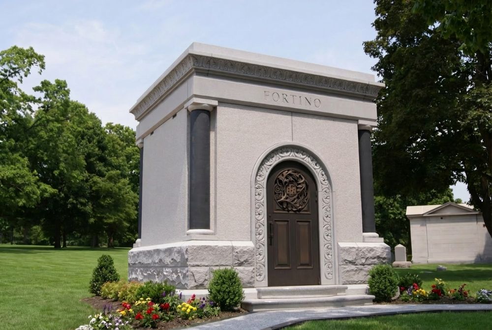 The Fortino mausoleum features turned columns in a contrasting color and elaborate carving detail around the door. The solid bronze door was custom made and features the patriarch's monogram.